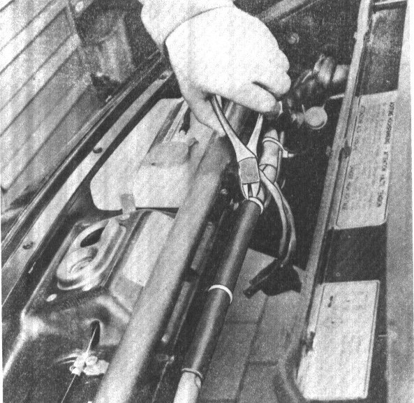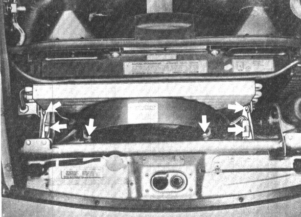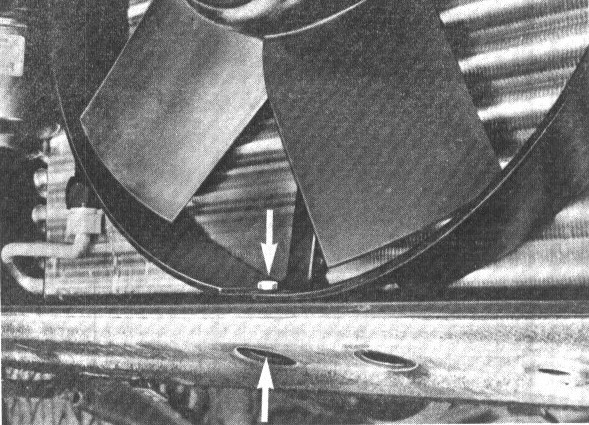 2. Pull off hose clamps on radiator. Disconnect wire plugs. Unscrew left and right brackets on condenser. Unscrew upper fan mountings.