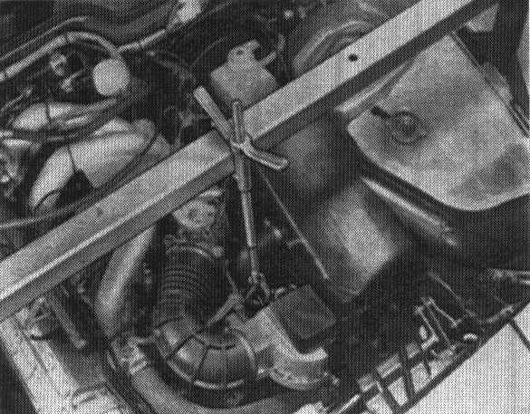 2. Suspend engine from front transport bracket with Special Tool VW 10 - 222 or VW 10 - 222 A and hold firmly in installed position.