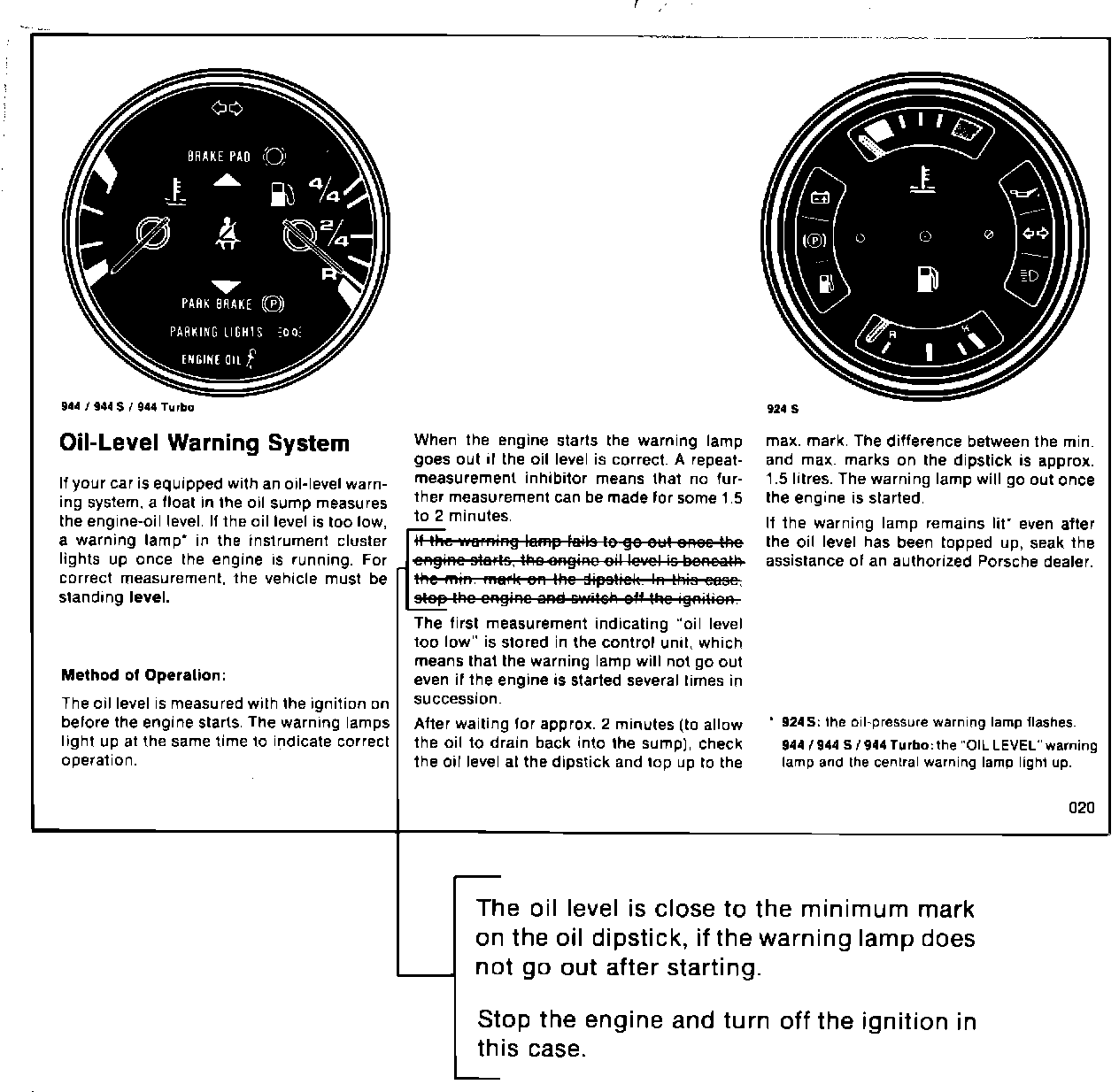 The information outlined below taken from the insert to the 944, 944S, 944 Turbo and 924S Owner's Manual has been clarified as indicated. Do not attempt to repair the oil level warning system for minimal discrepancies between the light activation and oil level indication on the dipstick.