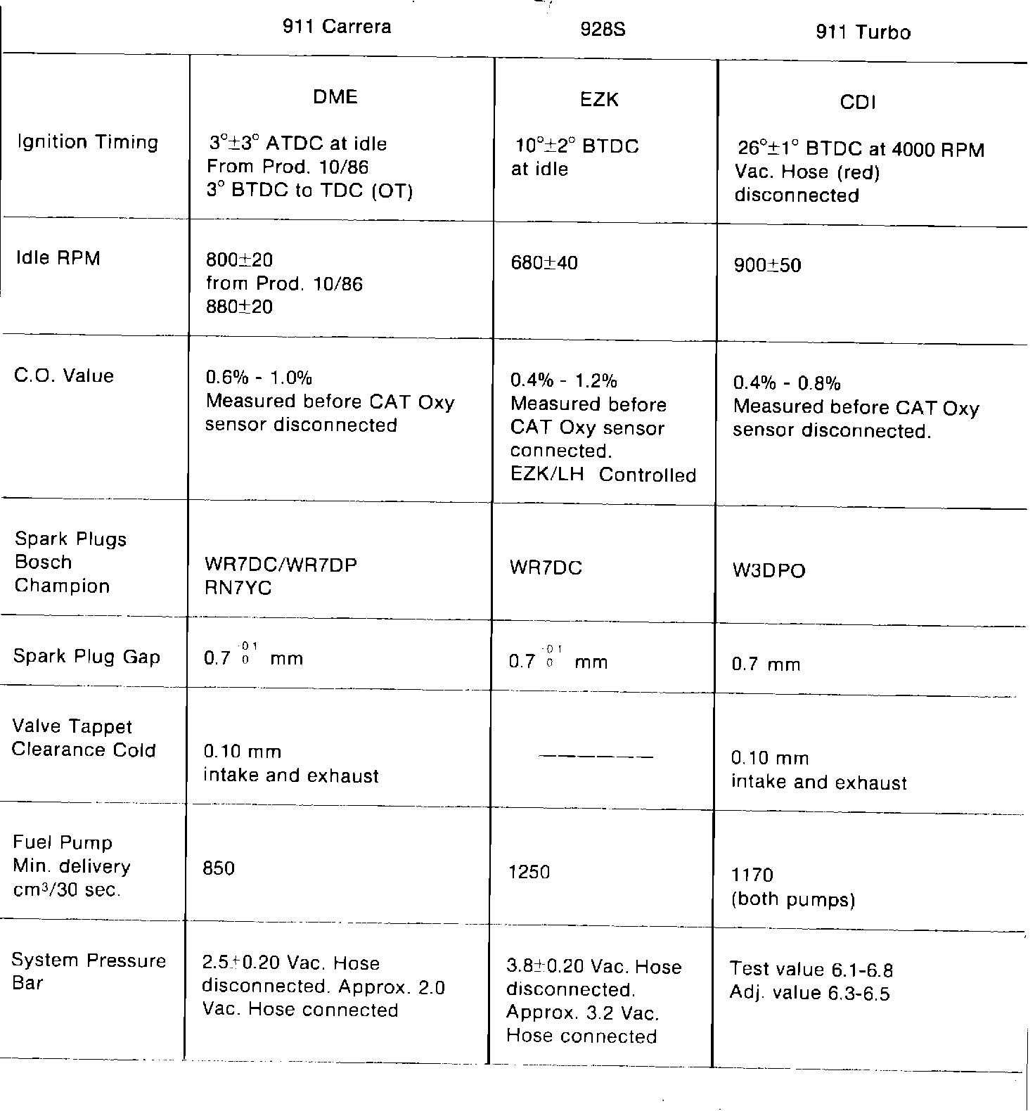 Tune-up Specifications for M.Y. 87