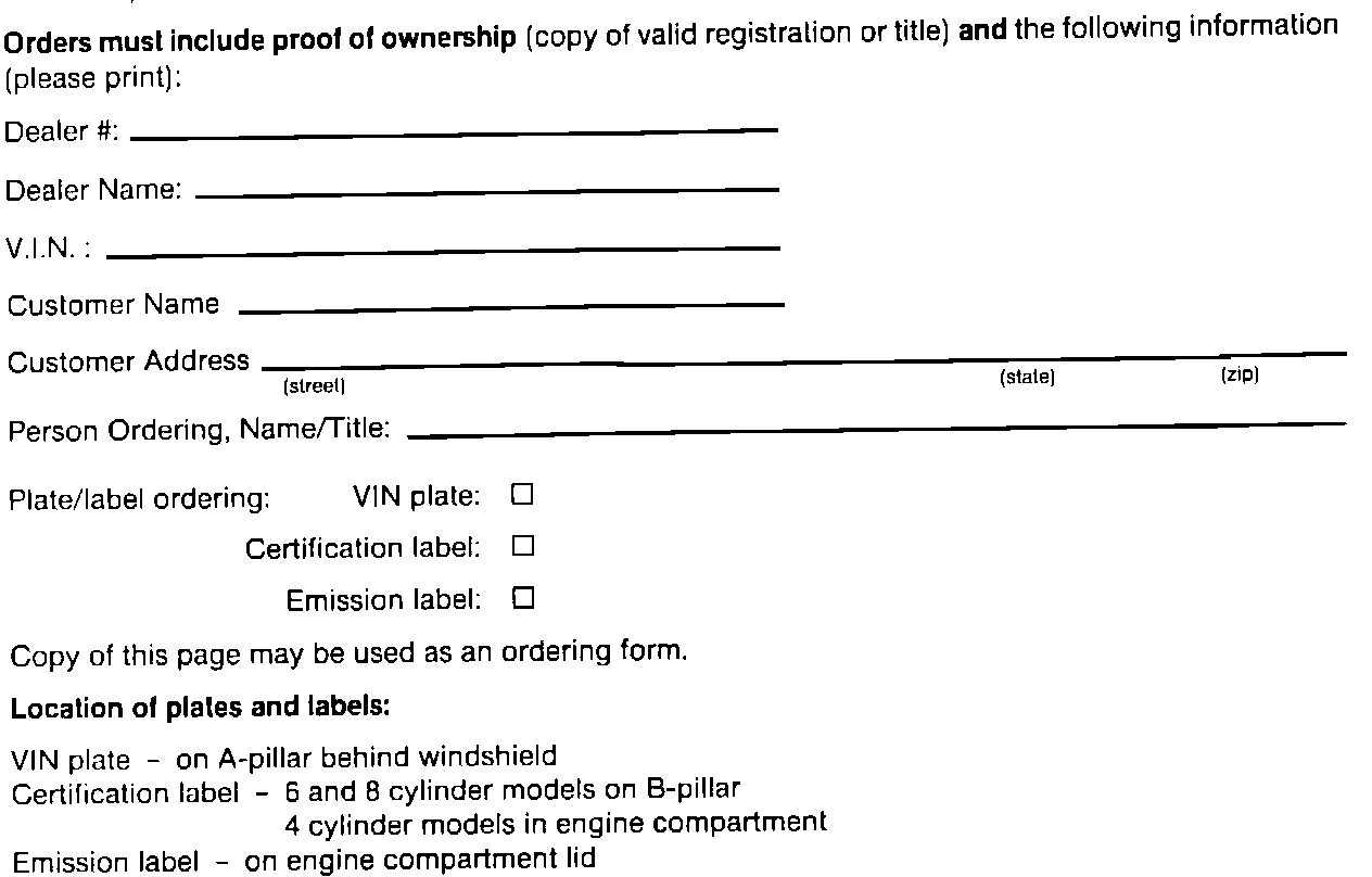 VIN plates, certification labels and emission labels can be purchased from Porsche Cars N.A. Technical Service Department. Plates and labels are only available for U.S. certified cars. No labels are available for vehicles declared "total loss" by an insurance company.