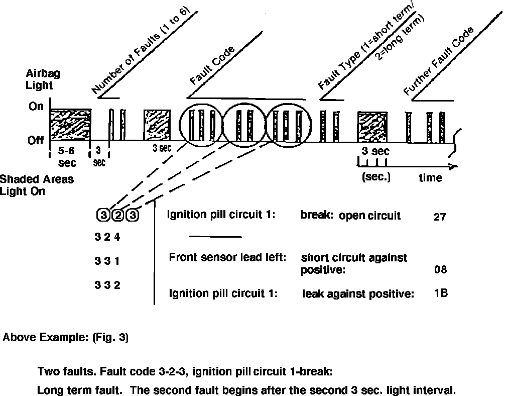 A fault in the airbag system can be read out via the airbag light. The flash code (Fig. 3) runs off automatically after stimulation of pin 2 of the airbag test plug with a timed ground signal (3 sec). The first fault code readout begins after the first 3 seconds light interval.