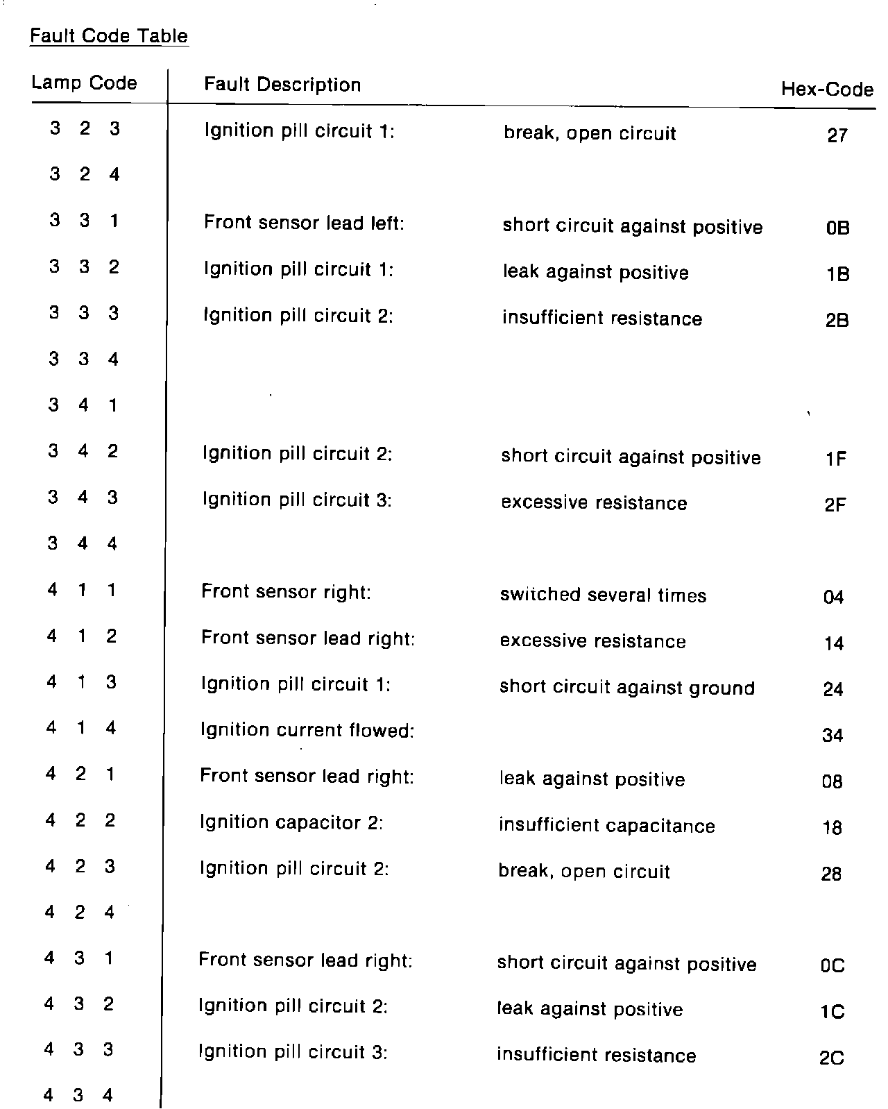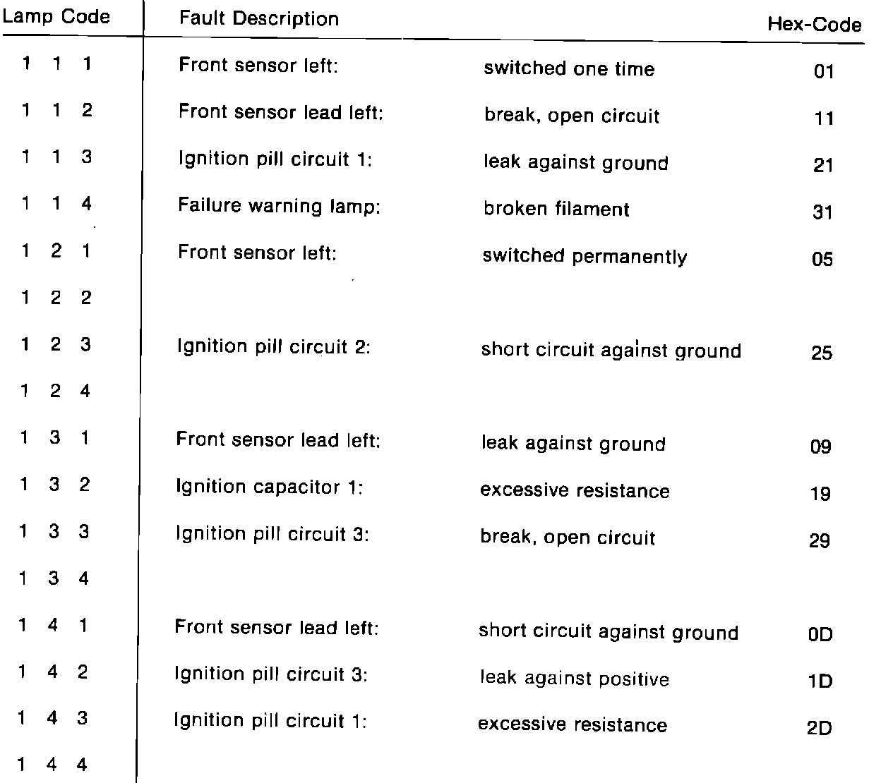 Hex code numbers refer to repair instructions regarding specific faults.
