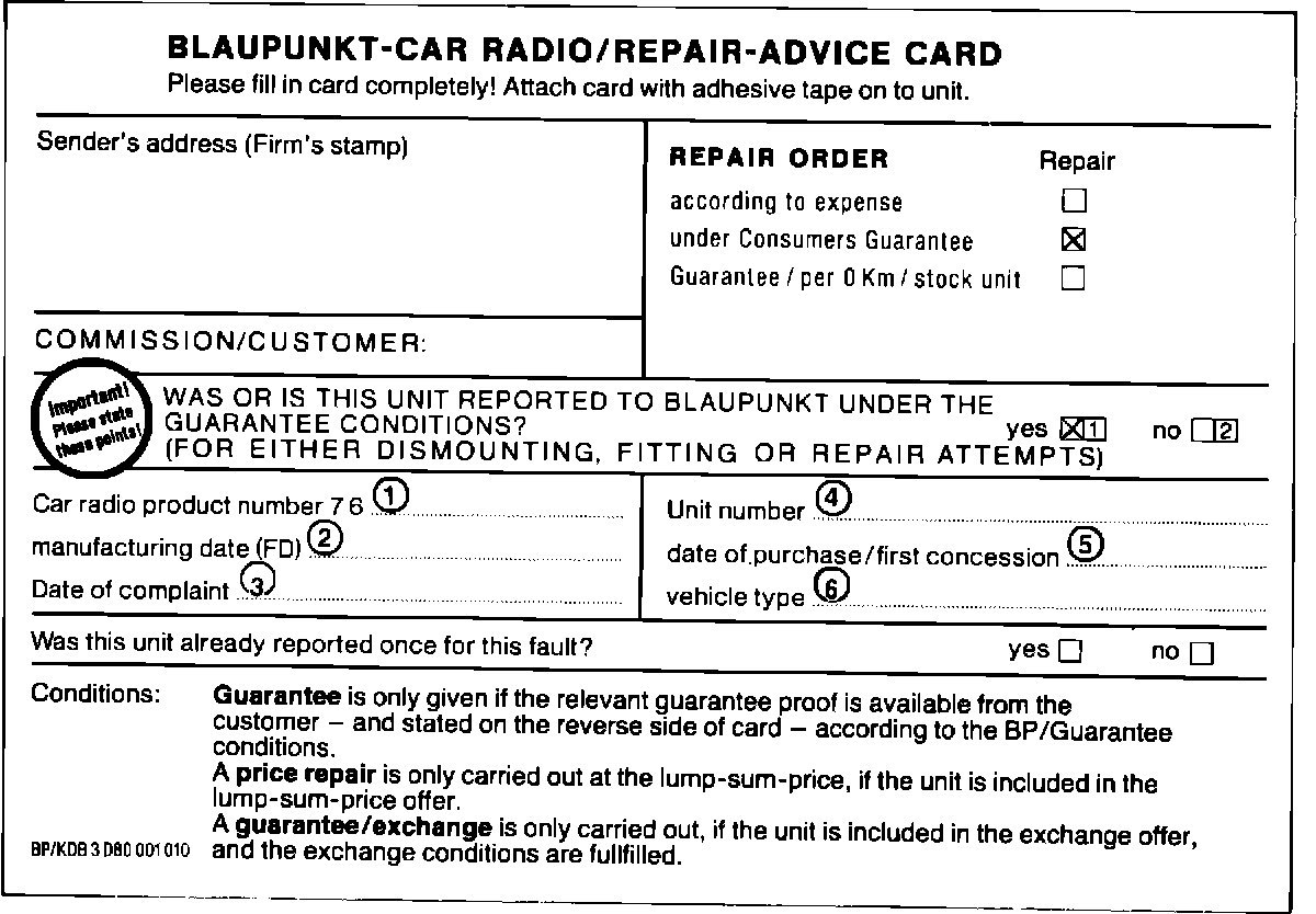 Blaupunkt-Car Radio/Repair-Advice Card completion instruction sample side 1:
