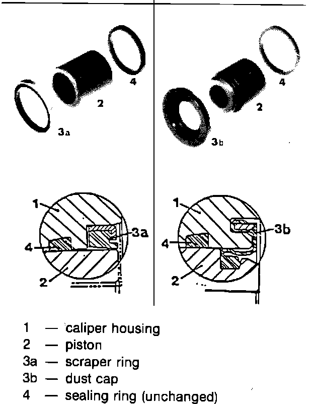Repair sets for early version and new type calipers are available. New type pistons and dust caps cannot be installed on early version calipers. When rebuilding brake calipers, use only sliding lubricant P/N 000 043 117 00 on the pistons and sealing rings during assembly. Refer to Technical Bulletin Group 4, Number 8901, dated April 2l, 1989 for further information.