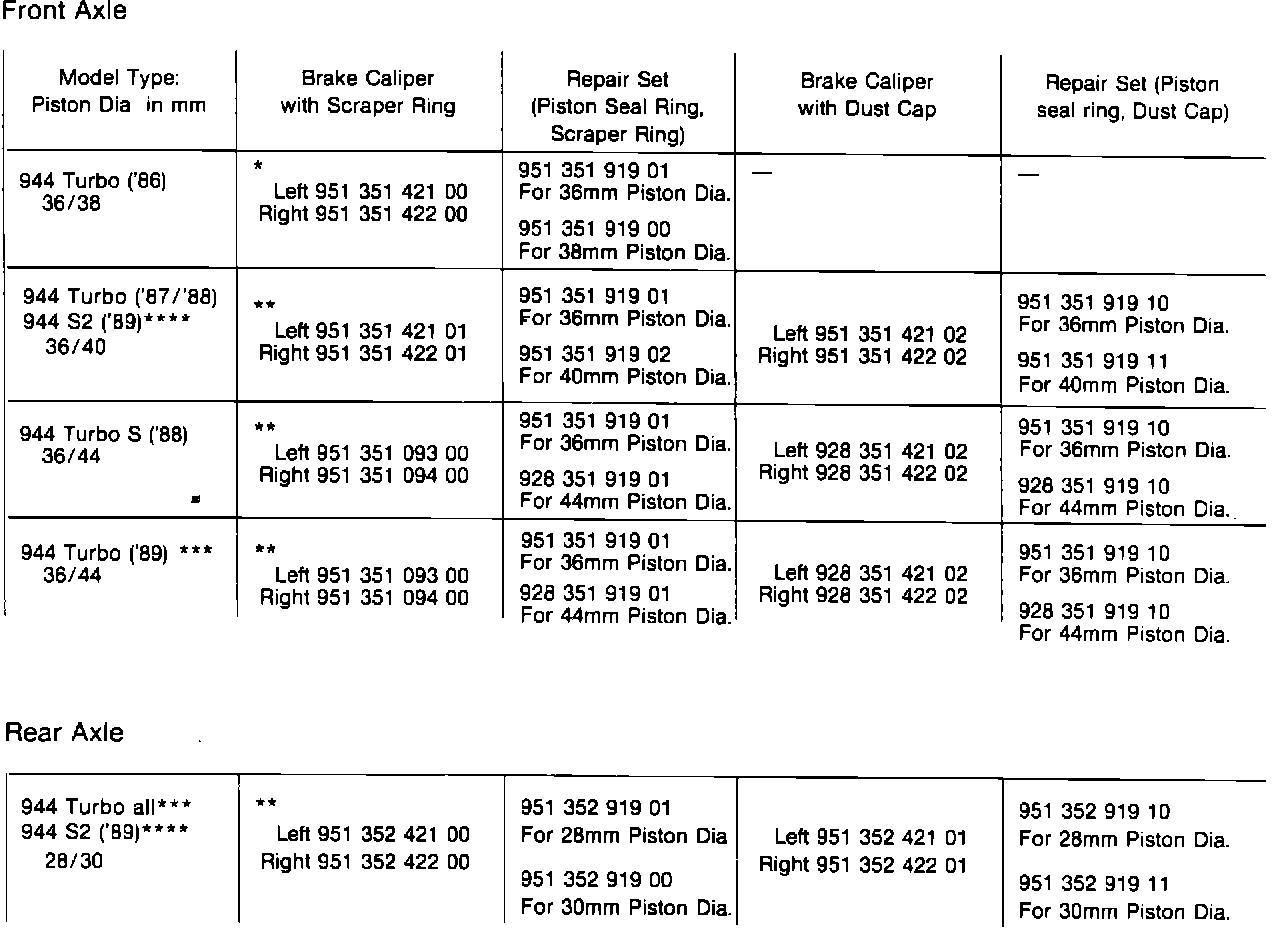 The front and rear brake calipers of the 944 S2, 944 Turbo, and 928 S4 for Model 89 received modifications in the area of the pistons and dust seals (now similar to the two piston calipers). Refer to the chart below for identification.