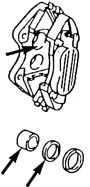 A light coat of heat resistant silicon sliding lubricant must be applied to the cylinder bore, piston and sealing ring, (arrows in figure) when assembling brake calipers.