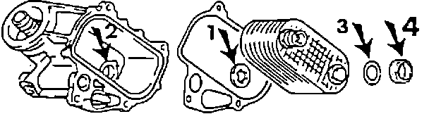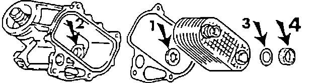 Before installing cooler assembly, mount a new rubber ring (arrow 4) onto crankcase and hold in place with light grease or Curil.