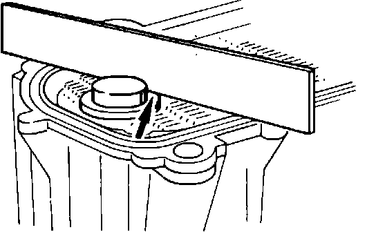 Install new version O-rings onto oil cooler. Install plastic washer onto cooler guide boss (use light grease to hold washer in place if necessary). Lubricate cooler O-rings with oil to prevent rolling and insert cooler into housing. Use straightedge on housing and determine distance between oil cooler guide boss and straightedge (see photo). With shims installed, measurement should be 0 +/- 0.25 mm. The oil cooler housing gasket is NOT included in the measurement. Thickness of one shim is 0.5 mm.