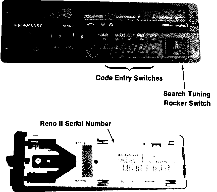 When the radio is switched on after the power supply was disconnected, the word "code" appears in the display. The 4-digit security code must be entered by using preset switches 1 through 4. Then press the LEFT SIDE of the search tuning rocker switch. If the code is entered correctly, the radio is ready to function again. If the code is entered incorrectly, the display shows for 10 seconds. After three unsuccessful attempts of entering the code, the waiting pedod is one hour, and after another 16 attempts the radio can only be decoded at the Blaupunkt service facility at customer expense.