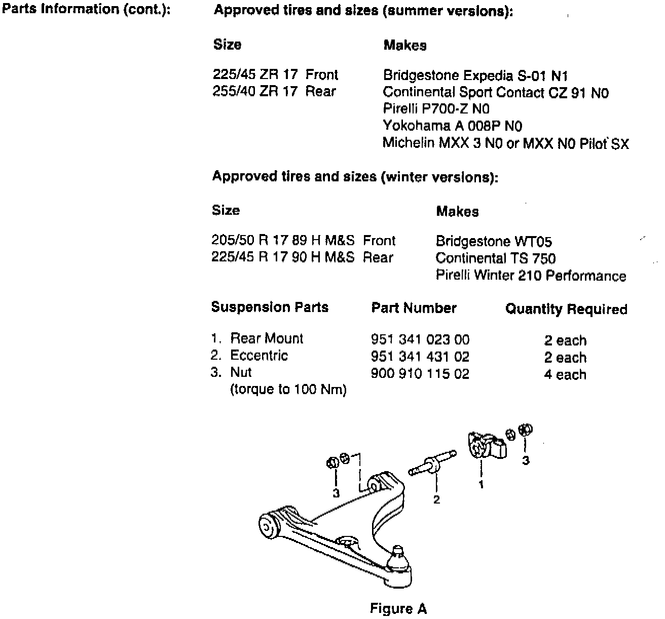 C. New caster eccentrics, rear mounts and nuts must be installed in the front control arms. This change is necessary due to a change in caster specification on vehicles equipped with Porsche 17" wheels. The specification for vehicles equipped with 17" wheels is 3° 15'-45 (see Figure A.)