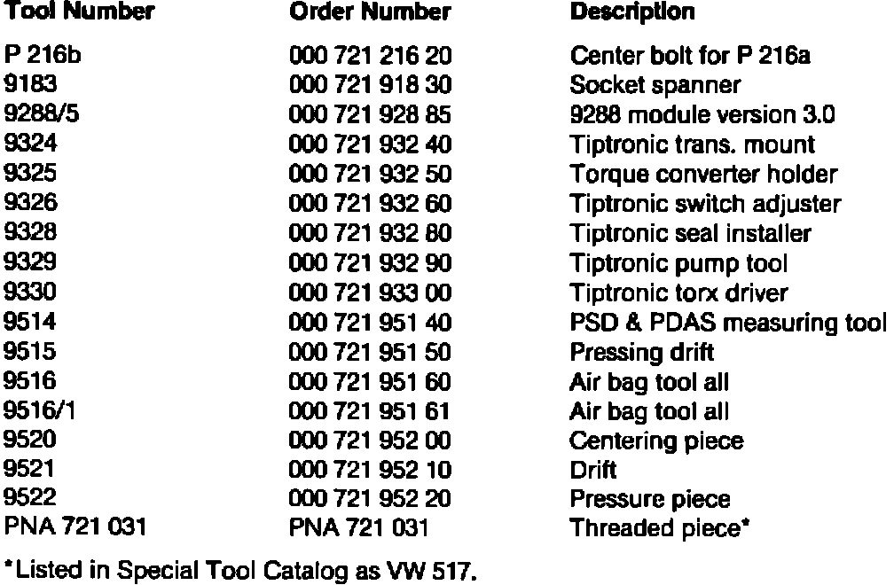 The Porsche Special Tools listed have either been shipped to your dealership or will be shipped soon. They are all minimum requirement tools. Here is brief description of the tools, the tool numbers, and the order numbers.