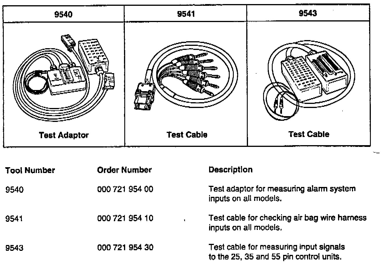 The following Porsche Special Tools will be arriving at your dealership soon. The tools pictured below are diagnostic tools used in testing and checking systems such as alarm system inputs, central warning system inputs, air bag system inputs and all 25, 35 and 55 pin control unit inputs. These tools are designed and required to prevent inducing faults into a system when checking the inputs of that system. For additional information on the use of the test adaptor and test cables, refer to the appropriate Porsche repair manual for instructions.