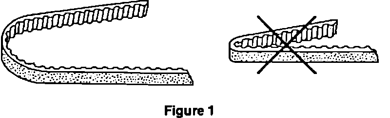 To prevent predamaging toothed belts, it is very important to avoid sharp bends when packing, storing and handling toothed belts (Figure 1).