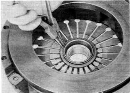 - Check tips of diaphragm springs for traces of wear from clutch release bearing. Scoring to a depth of 0.3 mm is not significant.