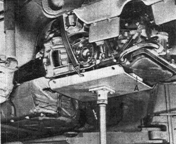 20. Remove center and rear cross members. Hold engine in installed position with VW 10-222.
