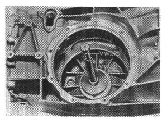 5. Press in outer race for small tapered roller bearing (in side cover). It is recommended to heat to cover. Use Special Tools VW 30 - 205 and VW 295.