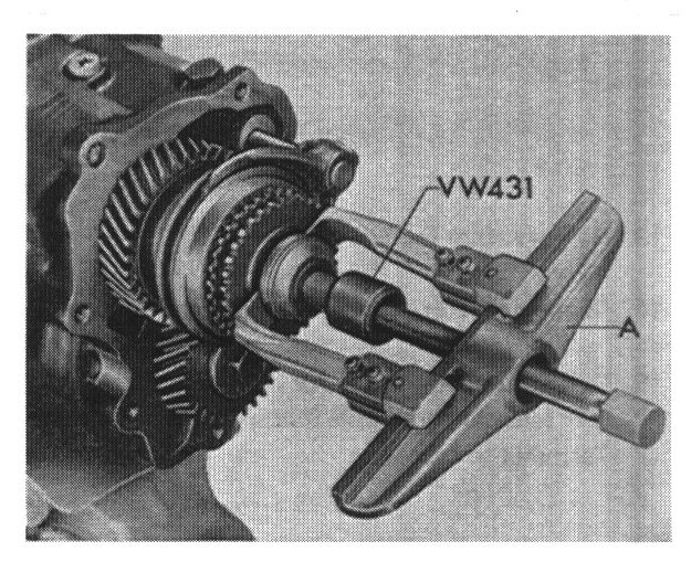 9. Remove 5th gear with sliding sleeve and synchronizer. needle bearing and 5th gear selector fork. Selector rod remains in gear carrier!