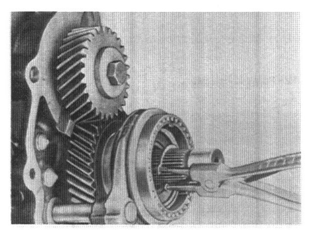 Note: For transmissions with reverse gear synchronization disconnect spring clamp for reverse gear on pinion shaft end and turn aside.