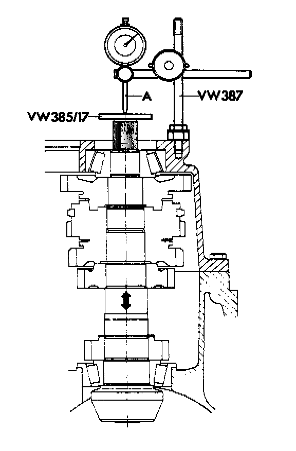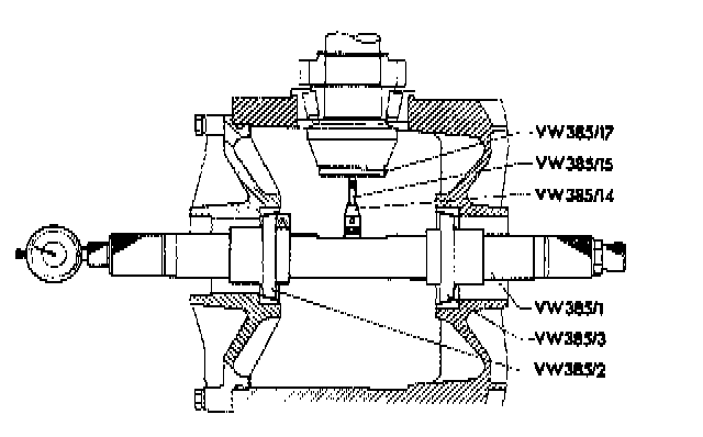 8. Remove the master gauge and insert the universal gauge into the housing (installed position). Centering disk VW 385/2 for final drive cover.