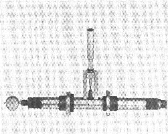 4. Mount gauges. Set dial gauge (3 mm range) to 0.0 with 1 mm preload. Dial gauge extension length approx. 30 mm.