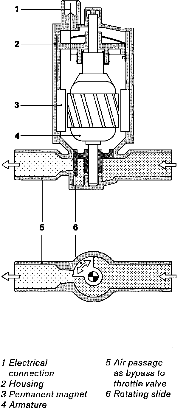 The idle speed positioner keeps the idle speed stable under the various engine operating conditions. The idle speed positioner consists of two opposed windings, an armature and a rotary slide. The DME control unit regulates the idle by controlling the amount of time each winding is energized. The amount of bypass air is determined by a variable orifice in the idle control valve. The DME control unit compares the actual engine speed with the programmed speed. By varying the time each winding is energized, the opposing forces on the armature cause it to take a fixed position, allowing enough bypass air to maintain the correct idle speed.