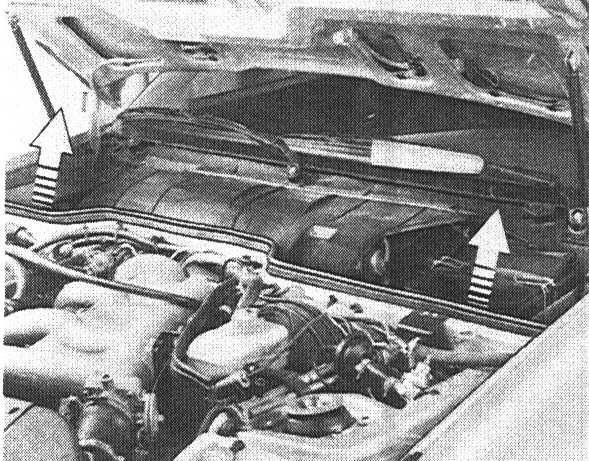 1. Remove fresh air well cover. This is done by disconnecting and pulling off windshield wiper arms. Pull off rubber seal from above and loosen cement of cover underneath the windshield. When performed carefully, the cover can be folded up to the windshield. It is then not necessary to remove the wiper arms.