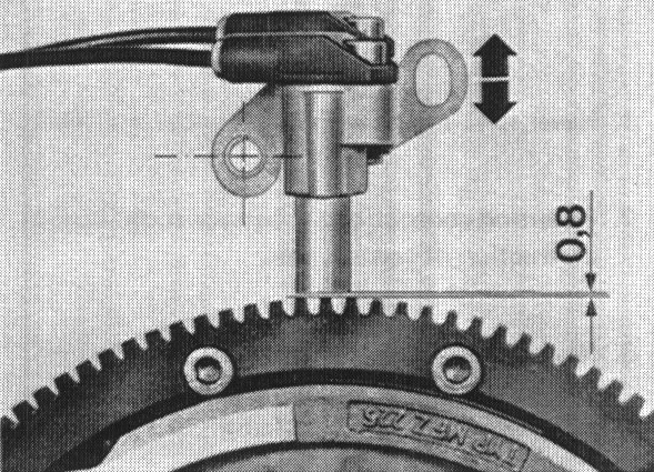 ADJUSTING CLEARANCE ON SPEED AND REFERENCE MARK SENSORSNote: A clearance of 0.8 mm is specified between the speed sensor and ring gear. If this clearance is correct, the reference mark sensor will be positioned correctly automatically.