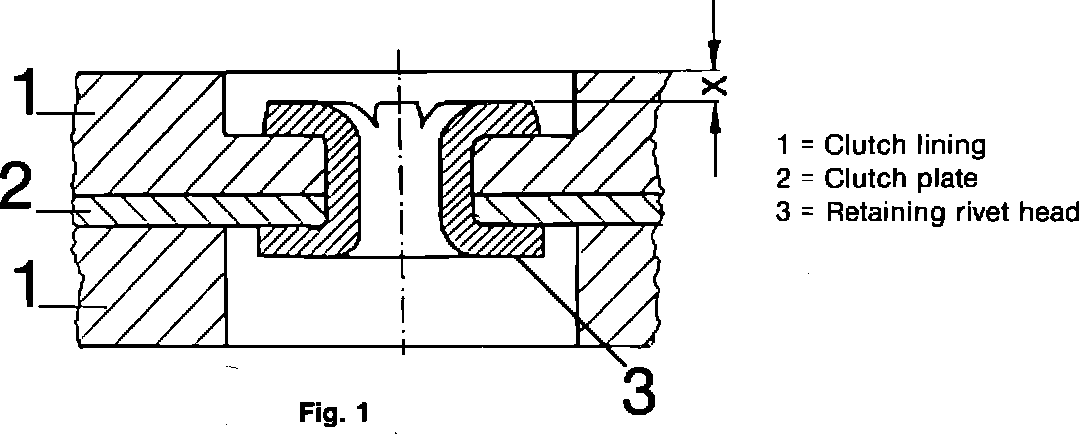 Measure from the clutch lining material (Fig. 1) to the retaining rivet. Be sure to measure only opposite the rivet head.