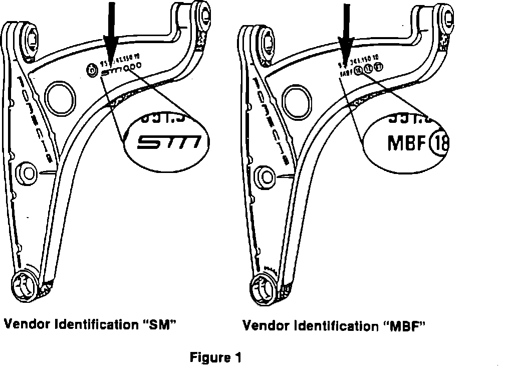 A-arms with vendor identification "MBF" are approved for use. A-arms with vendor identification "SM" must be replaced.