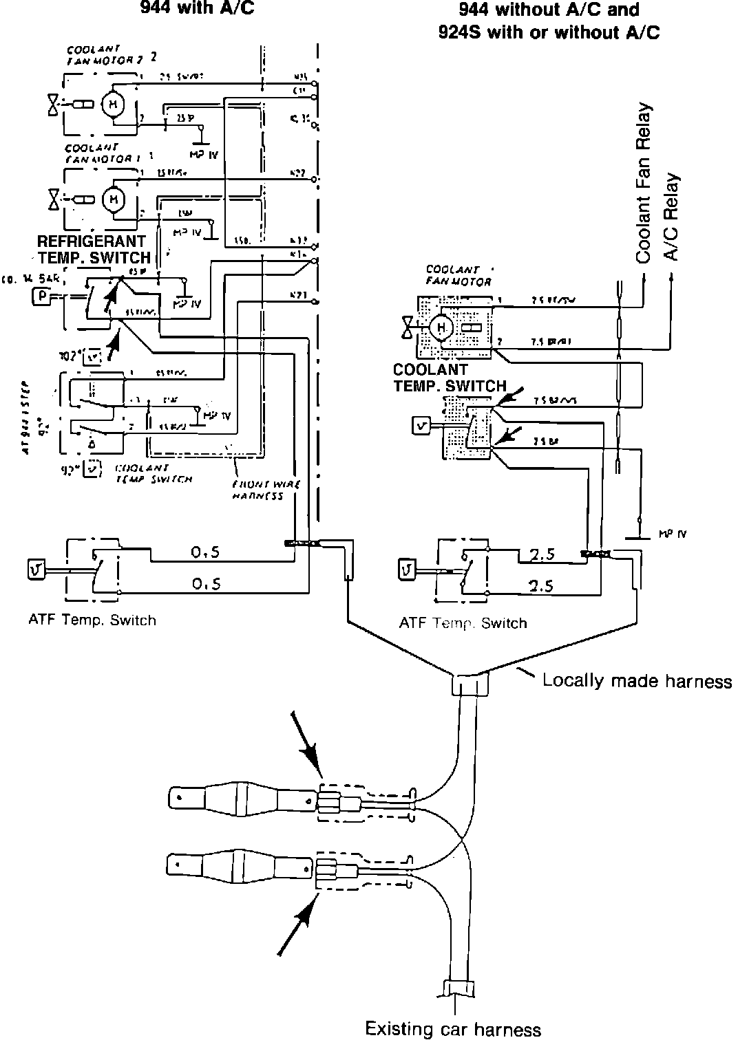 Note: On 944 with air conditioning, route the end of the harness to the area of the high pressure switch on the receiver dryer. On 944 without air conditioning and all 924S, route the harness to the radiator fan switch at the left upper area of the radiator.