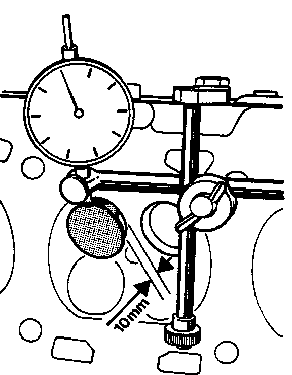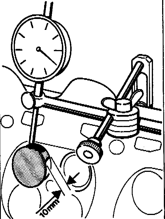 4. The tilt play is measured with 10 mm valve stroke (distance between the valve disk and valve seat). Wear limit for intake and exhaust guides = 0.80 mm.