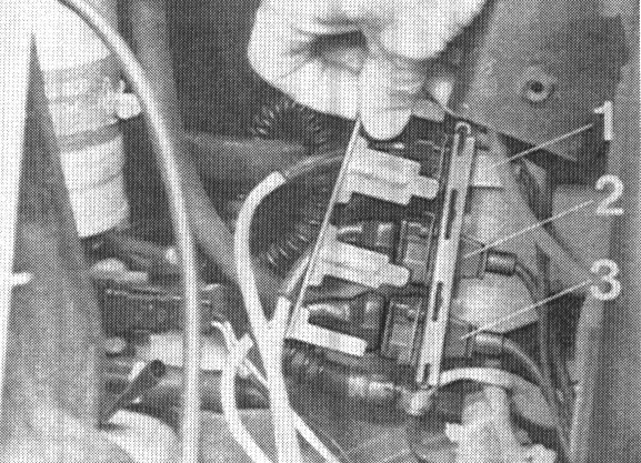 1. Disconnect center plug (2) in engine compartment at left side on plug plate.