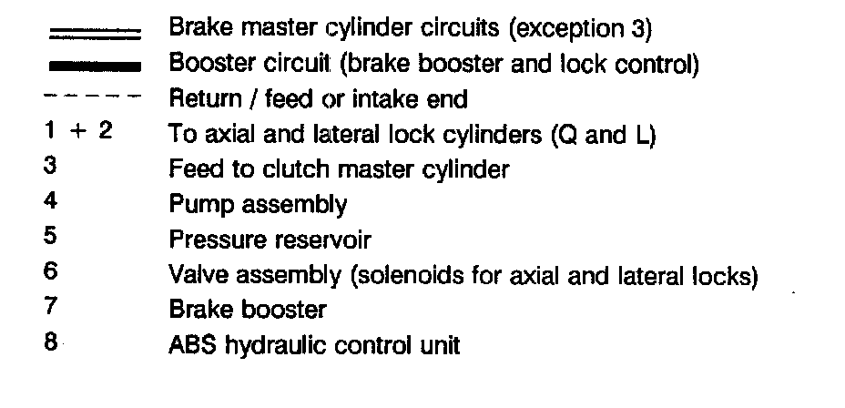 Since brake master cylinder circuits, consisting of the push rod circuit (for front axle) and intermediate piston circuit (for rear axle) with the ABS hydraulic control unit, are completely independent of the booster circuit (brake booster and lock control), brake fluid replacing and bleeding procedures are divided into different jobs.