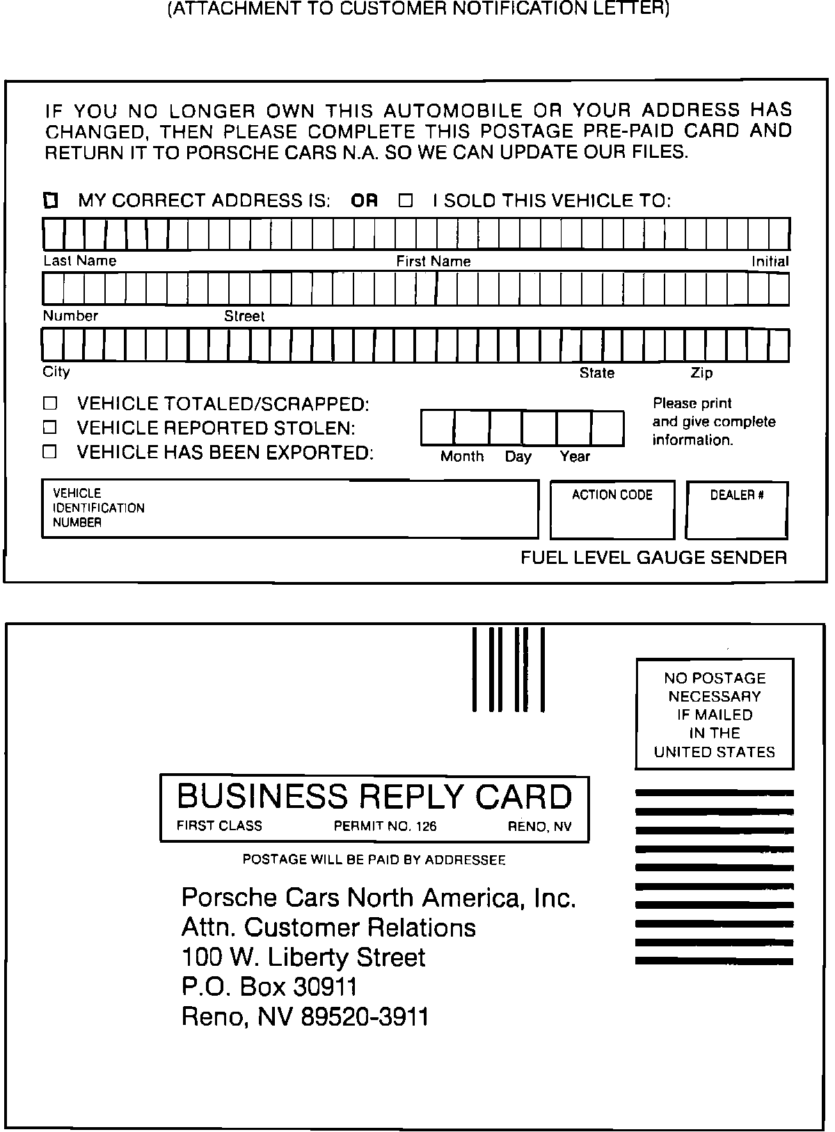 As a gesture of our appreciation that you have purchased a Porsche and for the patience and understanding that a technical problem of this nature requires, we will provide you with the new book, Porsche - The Fine Art of the Sports Car by Lucinda Lewis. This new book captures some of the finest examples of each Porsche in beautiful color, and I am sure you will enjoy this collectible publication. Your dealer will provide you with this outstanding book upon installation or inspection of the new fuel gauge sending unit.