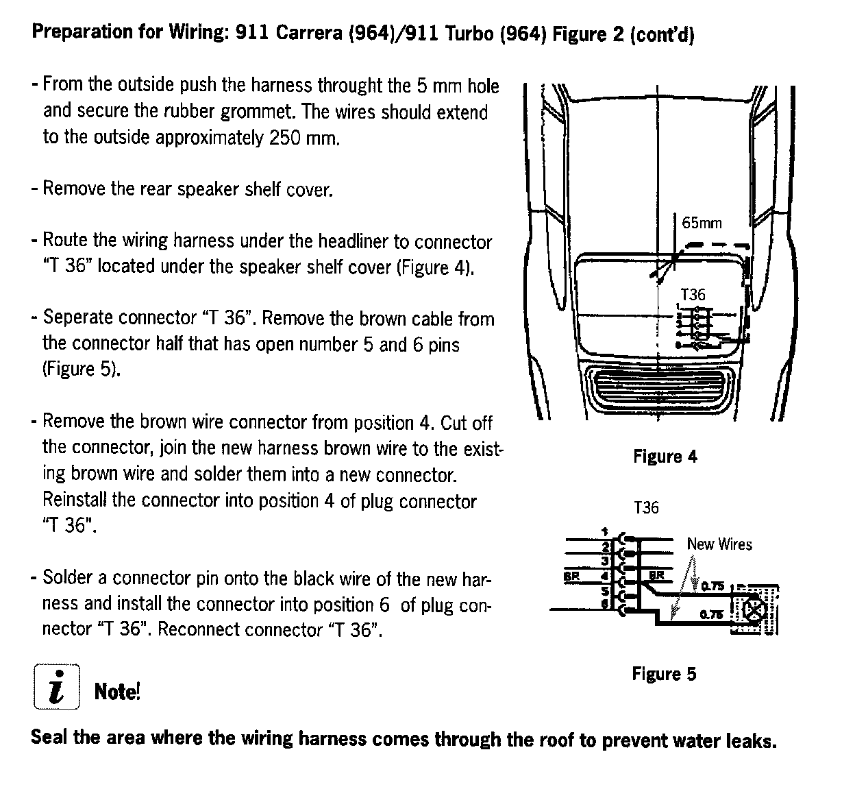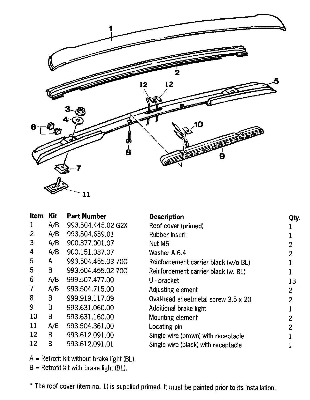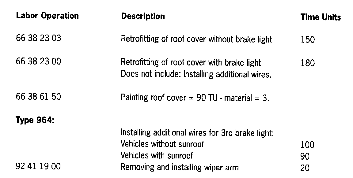 The roof mounted third brake light found on 1996 911 Carreras and Turbos can be retrofitted to the above-mentioned vehicles. This requires installation of locating pins on the rear window, the addition of electrical wiring (964 only), a changing of the rear wiper blade and wiper arm (Type 964 only) and painting of the outer roof cover in the vehicle color.