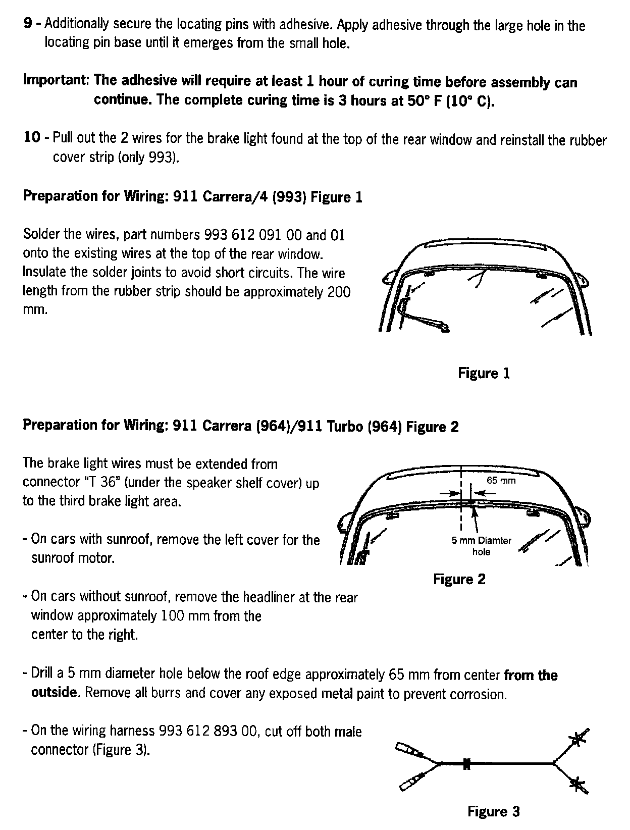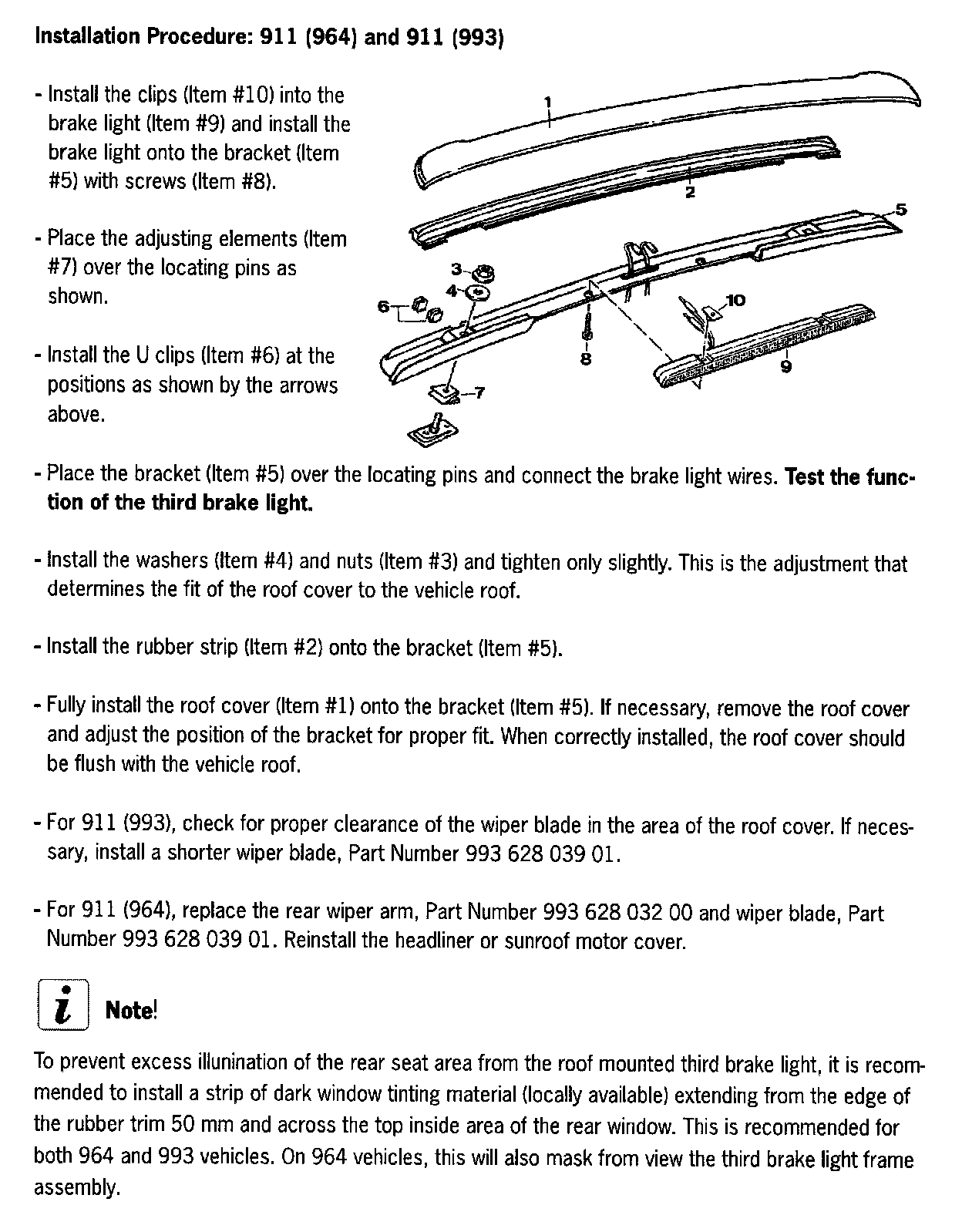 When installing the roof mounted third brake light on 911 Carrera 2/4 (964) model years 1989 to 1994 and 911 Turbo (964) model years 1991, 1992 and 1994, the existing third brake light can remain installed and operational or be removed as the customer desires. However, if the inside mounted third brake light is removed, the black screening on the glass will be visible. This screening cannot be removed from the rear window. As an alternative, the rear window can be replaced with a version having no screening for the third brake light:
