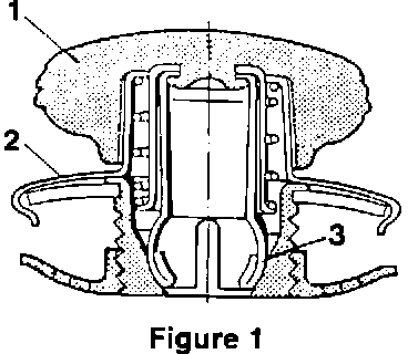 Tenax Snaps are used to secure the emergency folding top. The upper part of the snap (Figure 1) consists of the operating button (1) and the housing (2) with three tensioning springs (3).