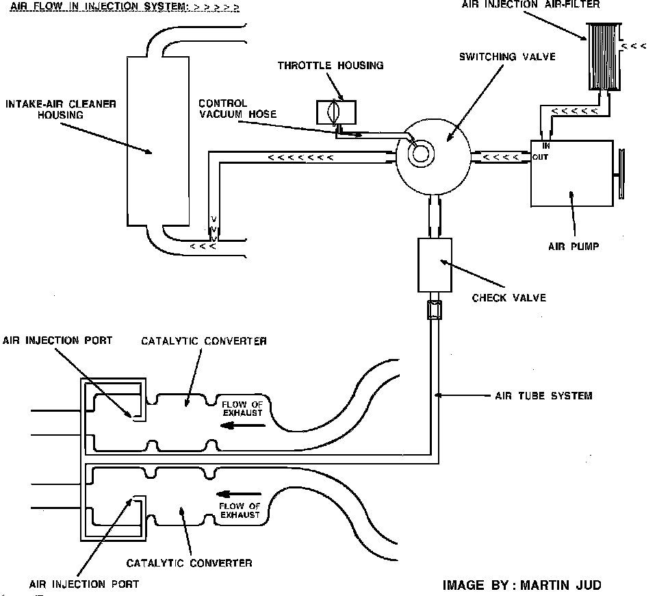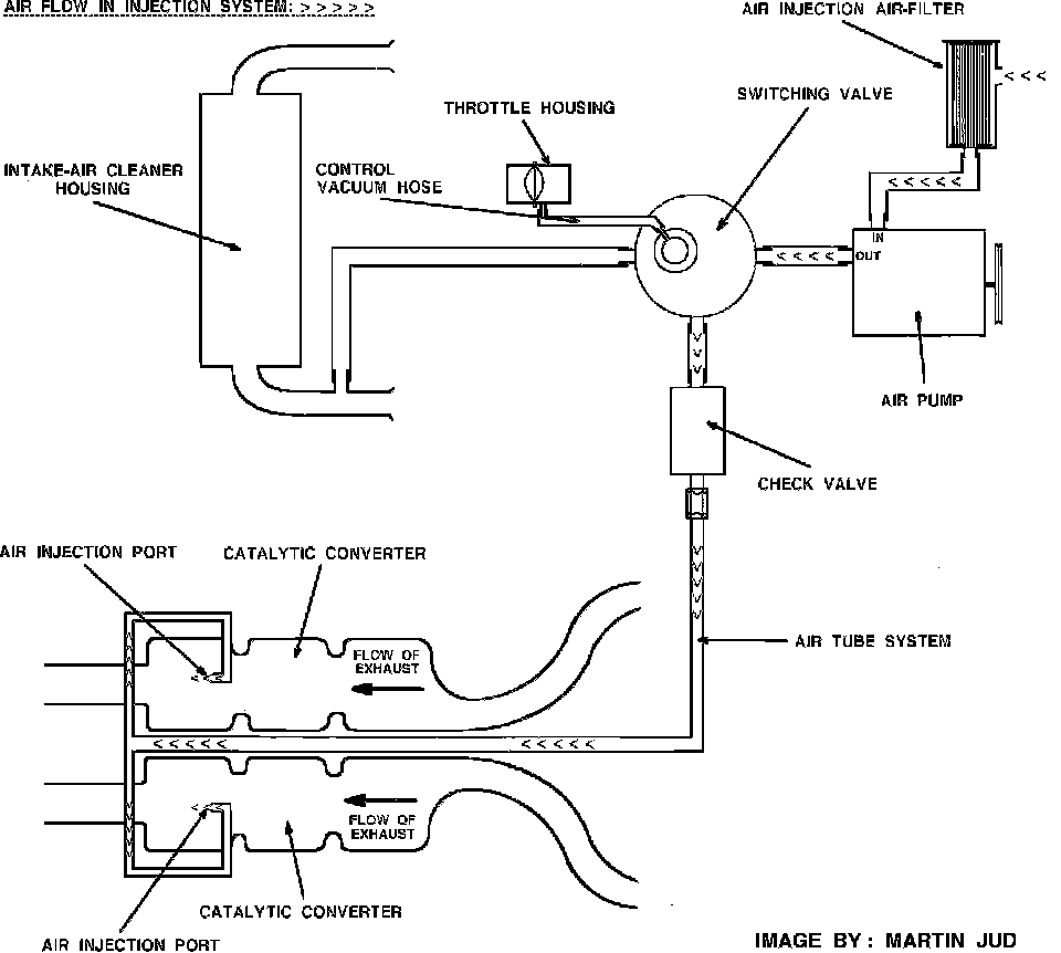 At idle speed and partial load, the air is routed from the air pump through the switching valve (vacuum controlled) to the check valve. From there it goes through the air tube system, where at the end, it gets injected into the catalytic converter, Fig. 1.