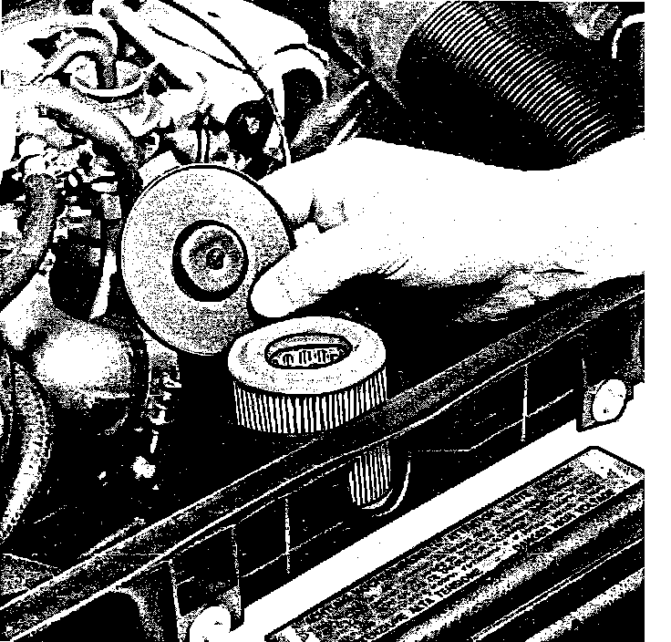 The air cleaner (located in center front of engine between air intake ducts) filters the outside air before it enters the air pump. The air filter element should be replaced every 48,000 km (30,000 miles), Fig. 6.