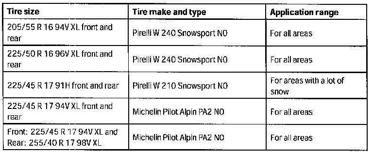 Permissible winter tires and wheel sizes