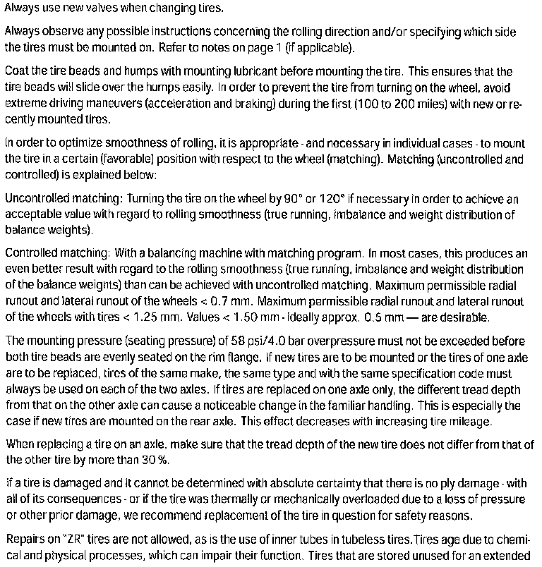 Repairs to "V", "W", "Y" and "ZR" tires should also be avoided, as well as the use of inner tubes in tubeless tires. Please inform your customers accordingly. It is adviseable to mount winter tires at temperatures below 45°F/7°C, because the driving characteristics of summer tires are reduced at low temperatures. Extremely low temperatures can cause permanent damage to summer tires.