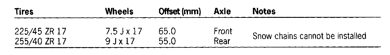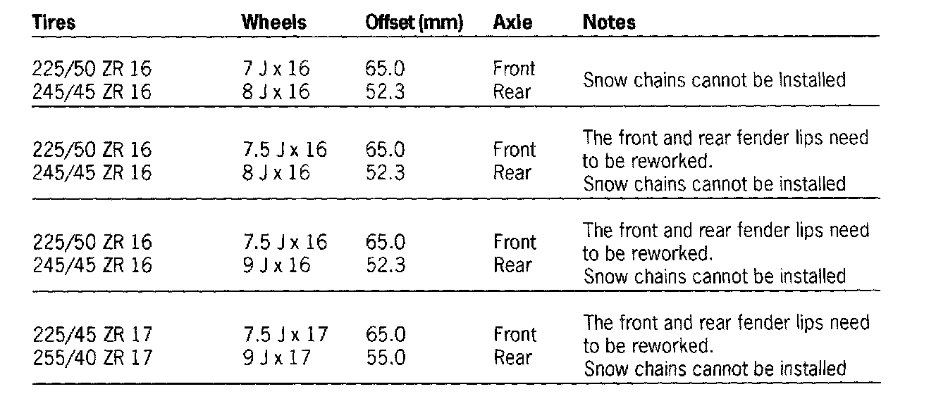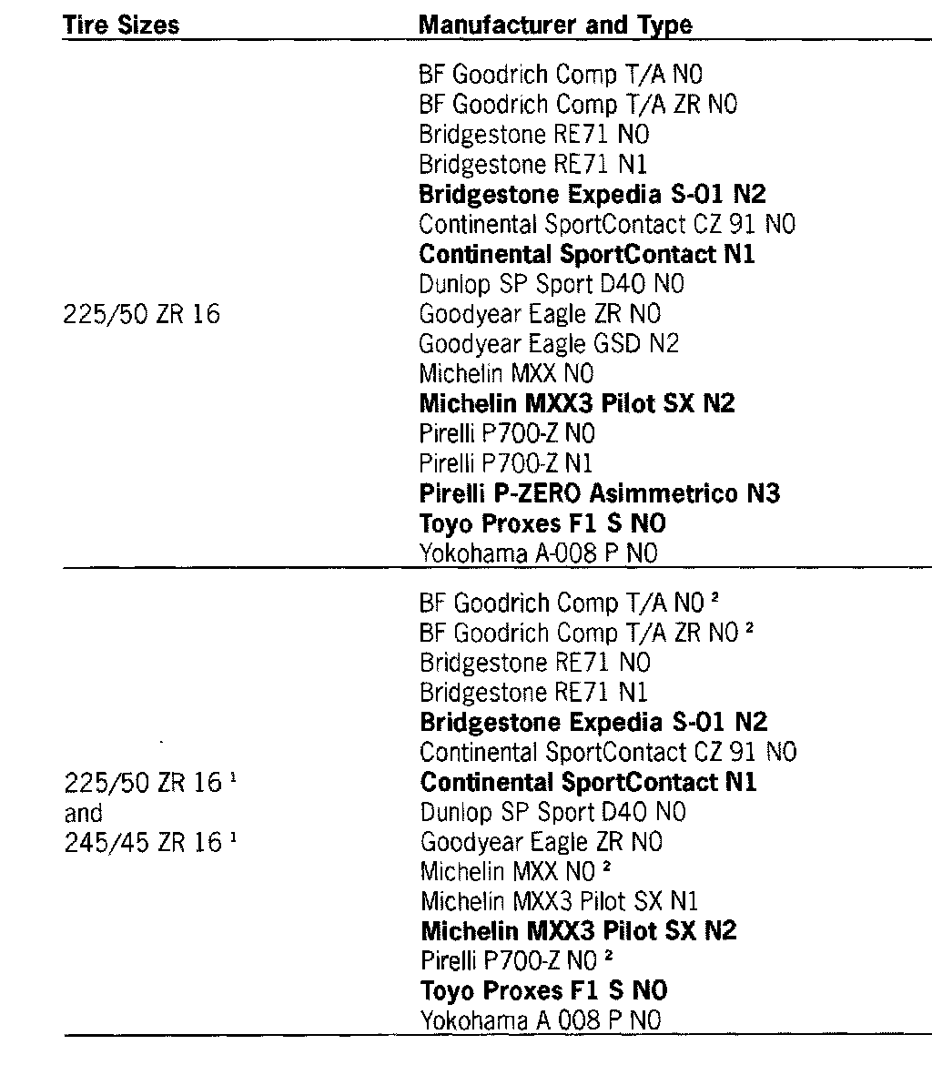 The tire types printed in bold correspond to the latest approval status and are available at tire suppliers since June, 2002. When replacing tires due to wear on front and rear axles or when replacing for any other reason it is recommended to only use these tire types.