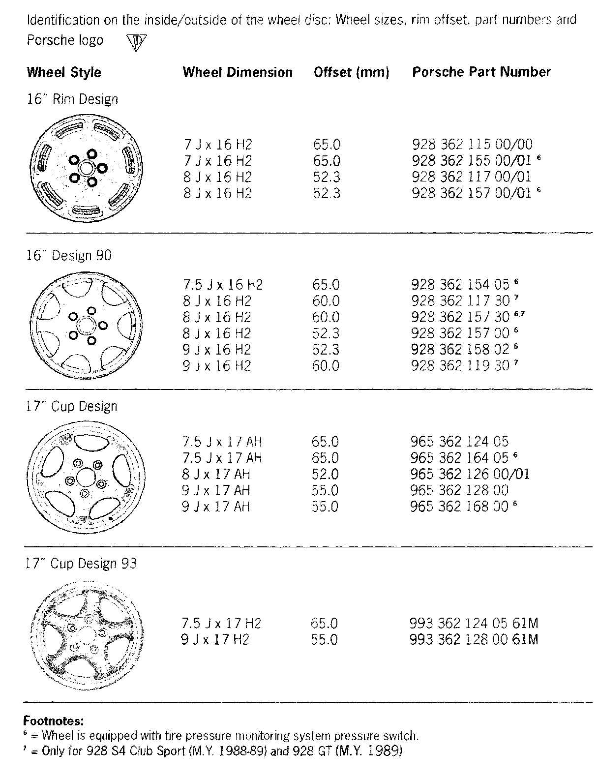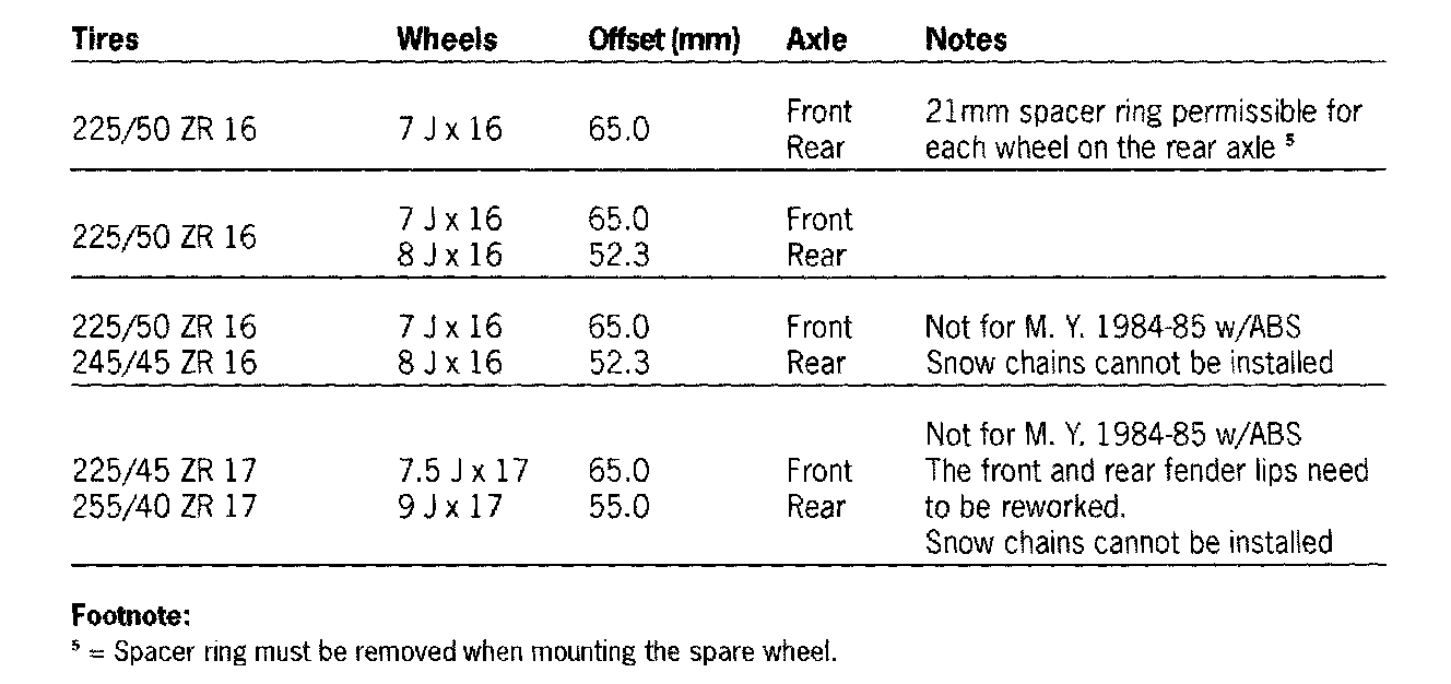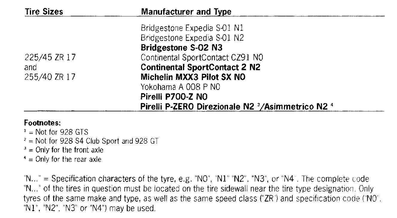 Approved summer tire, wheel and spacer ring sizes for 928/54/928 54 Club Sport/GT (1987 up to and including 1991)
