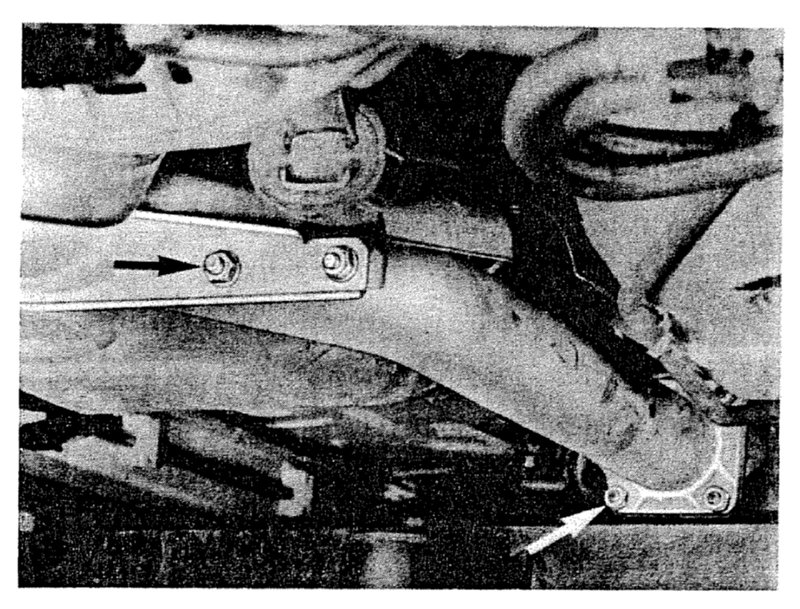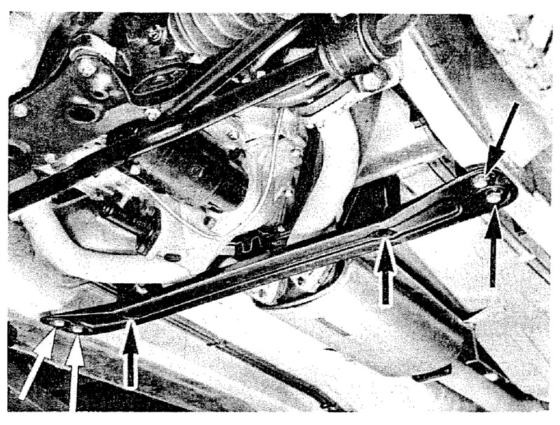 24. Place jack underneath rear axle cross member and remove mounting bolts from cross member.