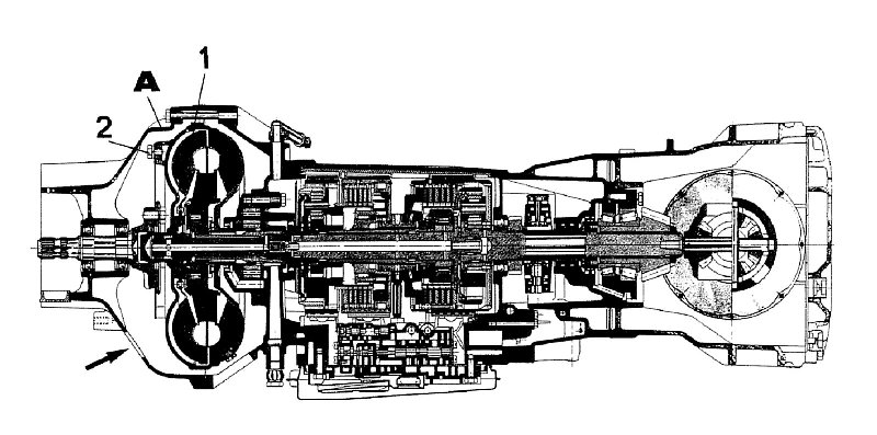 2. Remove 8 bolts holding front torque converter housing (A).