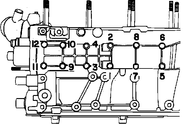 c. Torque bolts in sequence, Fig. 7. Torque M6 bolts to 6 ft. lbs. Torque M8 stud nuts in two steps to 11 and 22 ft. lbs. Torque M8 bolts in two steps to 11 and 14 ft. lbs. Check movement of balance shaft between each tightening step.