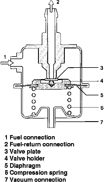 The pressure regulator controls the pressure in the fuel system. The pressure regulator is fitted at the end of the down stream side of the fuel injector rail. The pressure regulator is a diaphragm-controlled overflow type which maintains the fuel pressure at approx. 3 bar. It consists of a metal housing divided into two chambers by a beaded diaphragm: a spring chamber for the pre-stressed helical spring which rests on the diaphragm and a chamber for the fuel.