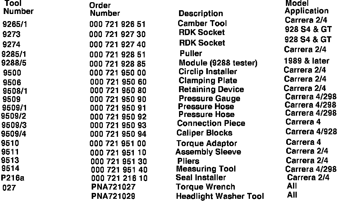 The following list contains model year 1989-1990 Porsche Special Tool information. These tools do not appear in the Minimum Requirement section of the Tools and Equipment binder, but are still a minimum requirement. Several of these tools have recently been shipped to your dealers and some will be shipped shortly. When the printing of the new pages has been completed, all Porsche dealers will receive these pages to update this section of the Tools and Equipment binder.