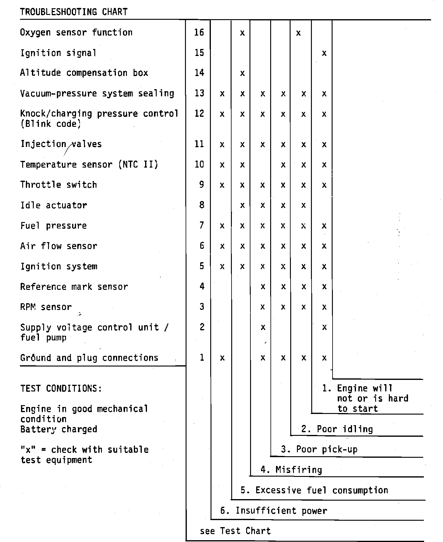 Refer to the chart for system problem determination. Follow applicable test points in numerical order for diagnosis. Complete all applicable test points and check component wiring before replacing or suspecting DME control unit. If a component is found to be defective, verify that original complaint has been resolved after replacing. If symptoms persist, return to beginning of diagnostic chart.